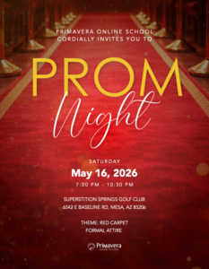 Prom is open to all Primavera Online School students currently in the 9th grade or higher. Students must be 15-20 years old as of May 16 to attend. Each student may bring up to three (3) guests – each guest must meet the same age requirements.